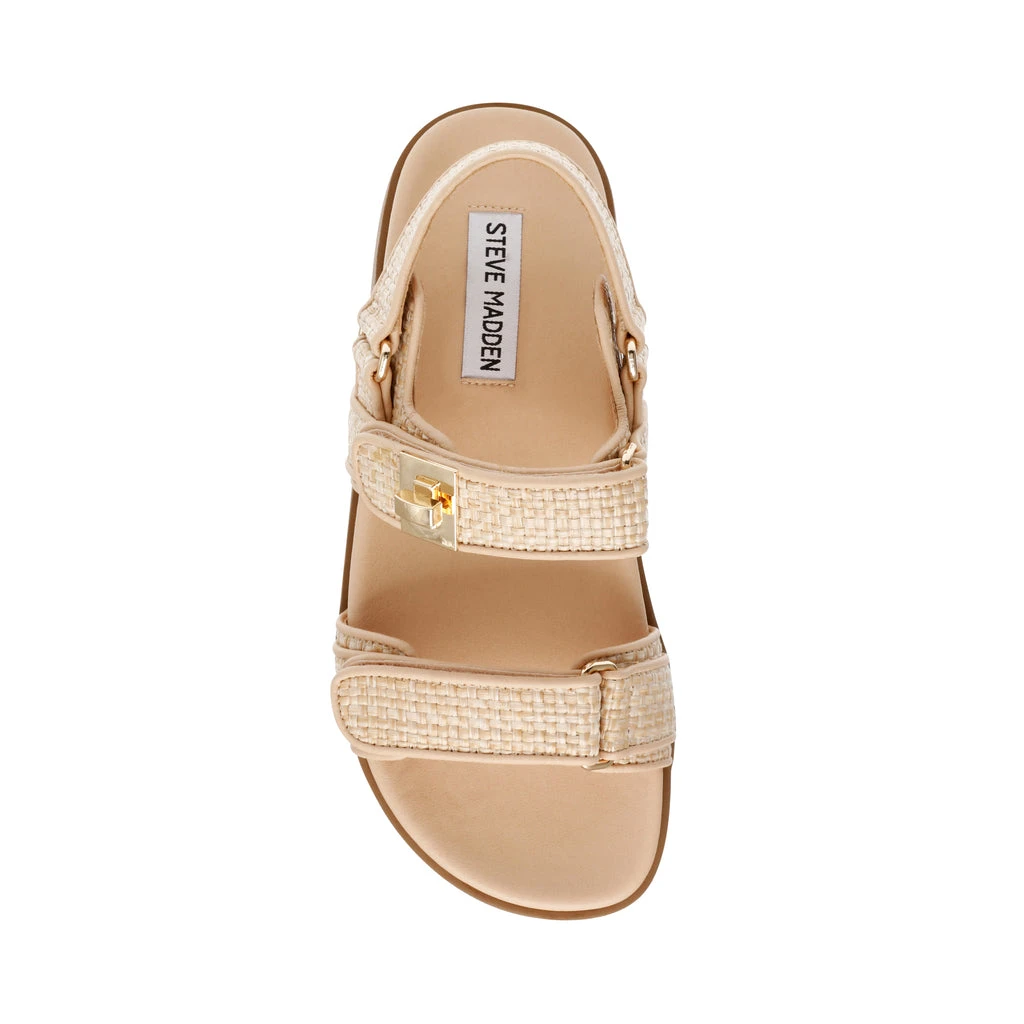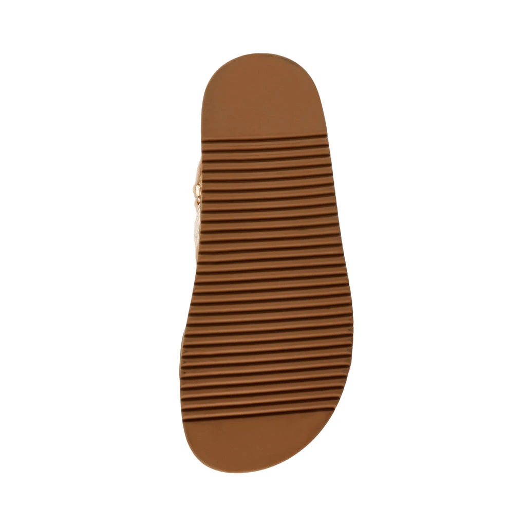 The MONA takes the classic three-strap sandal design with a molded footbed and a flat sole and elevates it with substantial gold tone hardware.